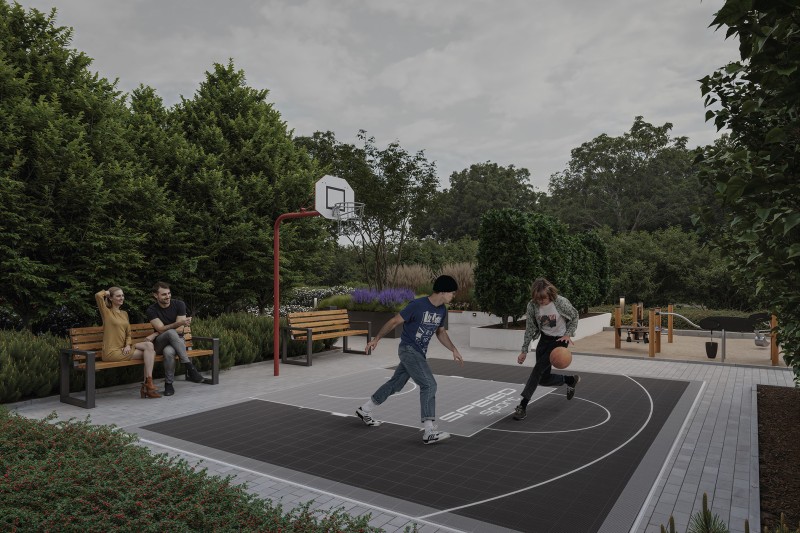 Boisko wielofunkcyjne to komfortowa przestrzeń do codziennej aktywności – bezpieczna, nowoczesna i harmonijnie wpisana w zieleń osiedla. Ruch i integracja zawsze w zasięgu ręki.