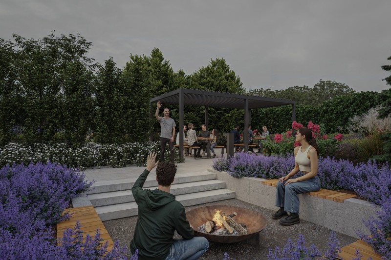 Kameralna przestrzeń rekreacyjna z nowoczesnym paleniskiem stanowi naturalne centrum wspólnych wieczorów i sąsiedzkich spotkań. Wygodne siedziska, starannie zaprojektowana zieleń oraz zadaszona wiata tworzą komfortowe miejsce do relaksu i integracji