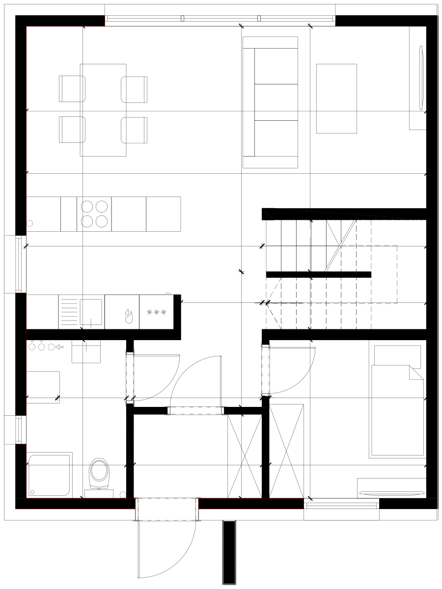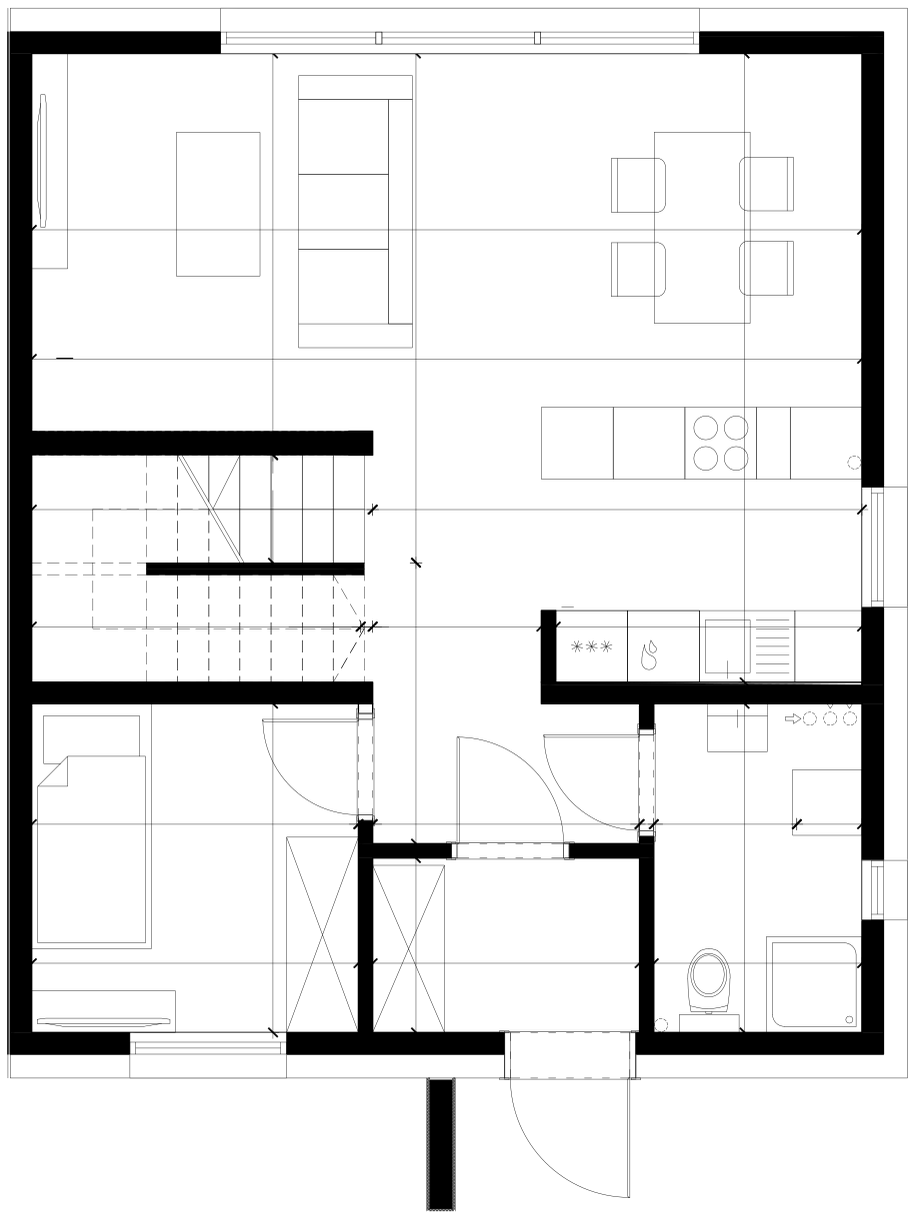 Pustynna 51 to wnętrza zaprojektowane do mieszkania. Z jasnym podziałem na strefę dzienną i nocną. Tak, by każdy domownik mógł się cieszyć spokojem i przestrzenią na pracę czy wypoczynek. Wejścia znajdują się od frontu — prowadzą do nich schody zewnętrzne. Tuż za wiatrołapem znajduje się hol, z którego można przejść do przestronnego salonu połączonego z kuchnią, spiżarni, gabinetu lub pierwszej z dwóch łazienek. To Twoja przestrzeń na codzienność: gotowanie, spotkanie z bliskimi i leniwe wieczory na kanapę, a także na pracę zdalną.